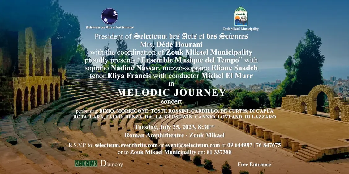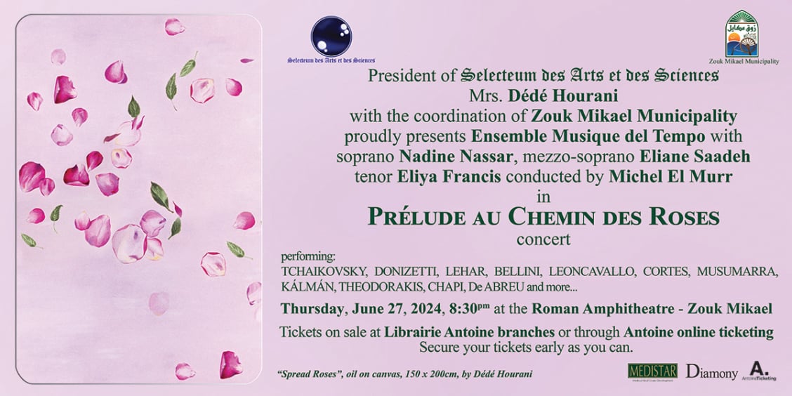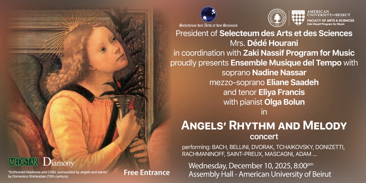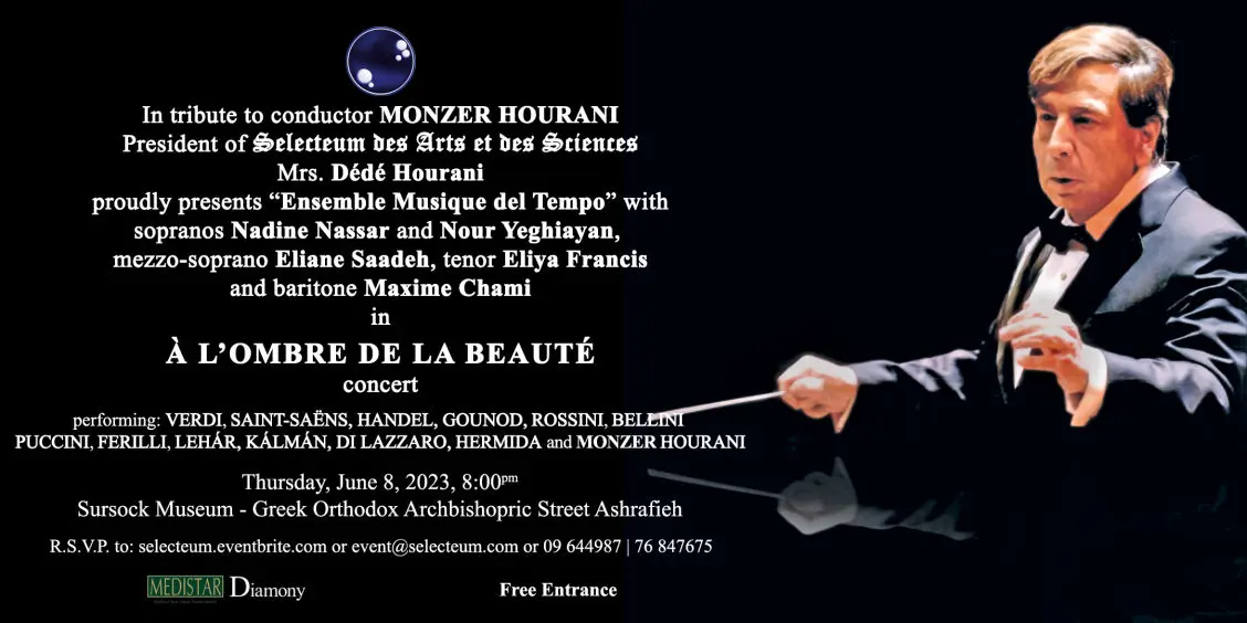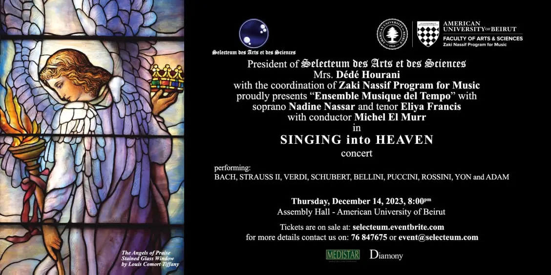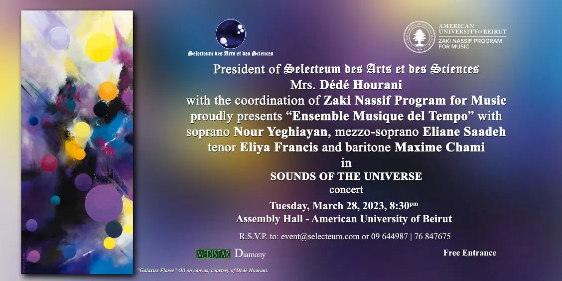 President of Selecteum des Arts et des Sciences Mrs. Dédé Hourani with the coordination of Zaki Nassif Program for Music proudly presents “Ensemble Musique del Tempo” with soprano Nour Yeghiayan, mezzo-soprano Eliane Saadeh, tenor Eliya Francis and baritone Maxime Chami