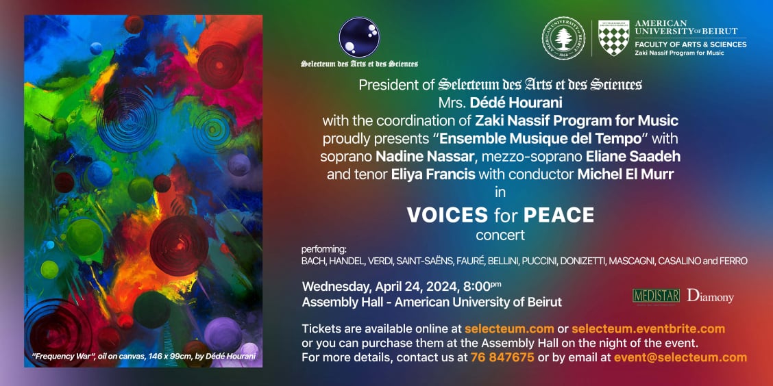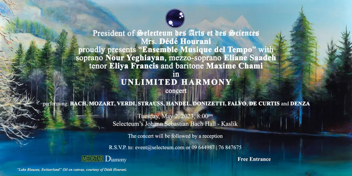 President of Selecteum des Arts et des Sciences Mrs. Dédé Hourani proudly presents “Ensemble Musique del Tempo” with soprano Nour Yeghiayan, mezzo-soprano Eliane Saadeh tenor Eliya Francis and baritone Maxime Chami
